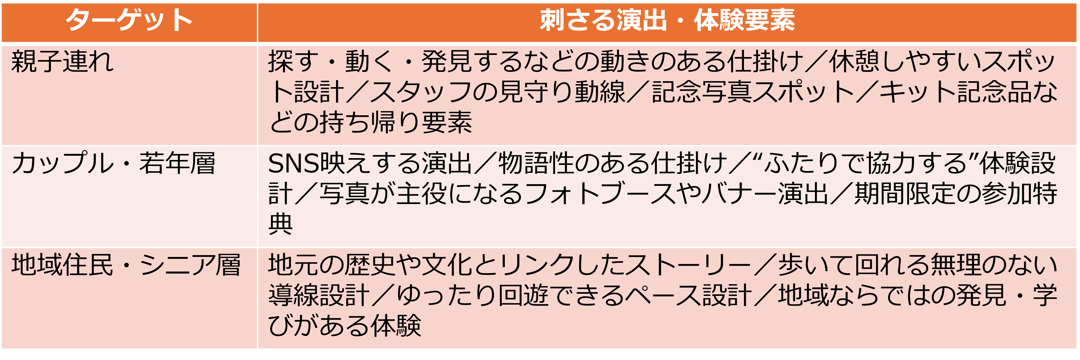 親子連れ、カップル、地域住民、観光客など、来場層のニーズや行動特性はそれぞれ異なるため、反応が良い仕掛けも当然変わってきます。