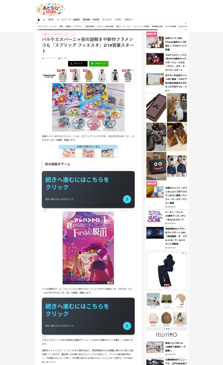 あとなびマガジン 様に「志摩スペイン村×リアル謎解きゲーム「アレハンドロと終わらないフィエスタからの脱出」」が紹介されました。