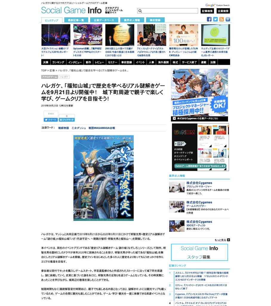 Social Game Info 様に「明智光秀×歴史リアル謎解きゲーム「謎の城」in福知山城「いざ!丹波平定へ」」が紹介されました。