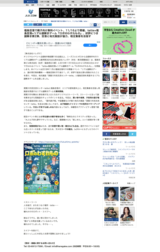 JIJI.COM 様に「tette×福島空港×リアル謎解きゲーム『ロボのわすれもの』」が紹介されました。