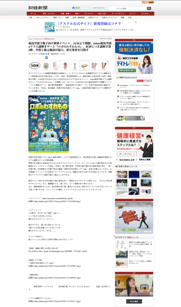 財形新聞 様に「tette×福島空港×リアル謎解きゲーム『ロボのわすれもの』」が紹介されました。