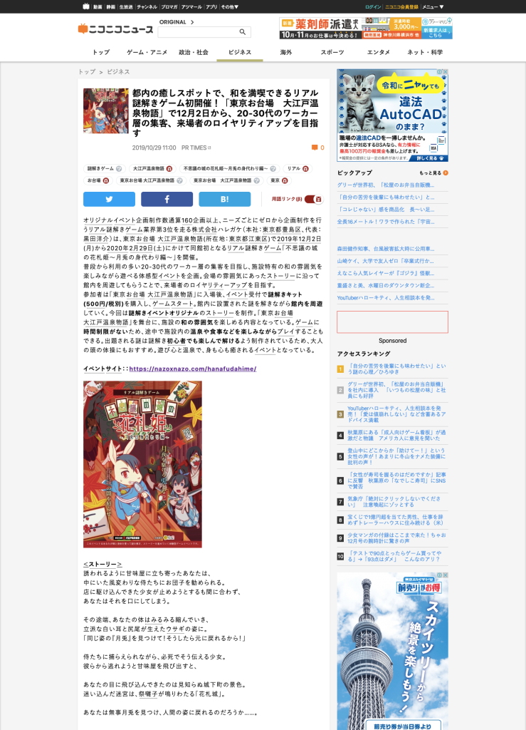 ニコニコニュース 様に「リアル謎解きゲーム「不思議の城の花札姫~月兎の身代わり編~」」が紹介されました。
