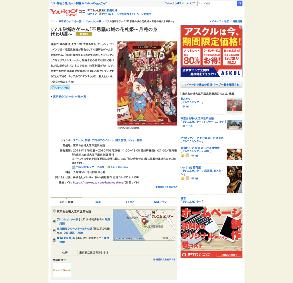 Yahoo!ロコ 様に「リアル謎解きゲーム「不思議の城の花札姫~月兎の身代わり編~」」が紹介されました。