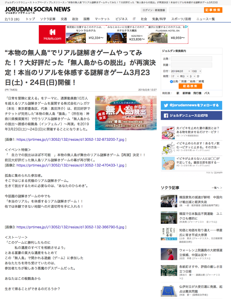 ジョルダンソクラニュース様に「無人島からの脱出~誘惑の殺戮島(インフェルノ)~再演」が紹介されました。