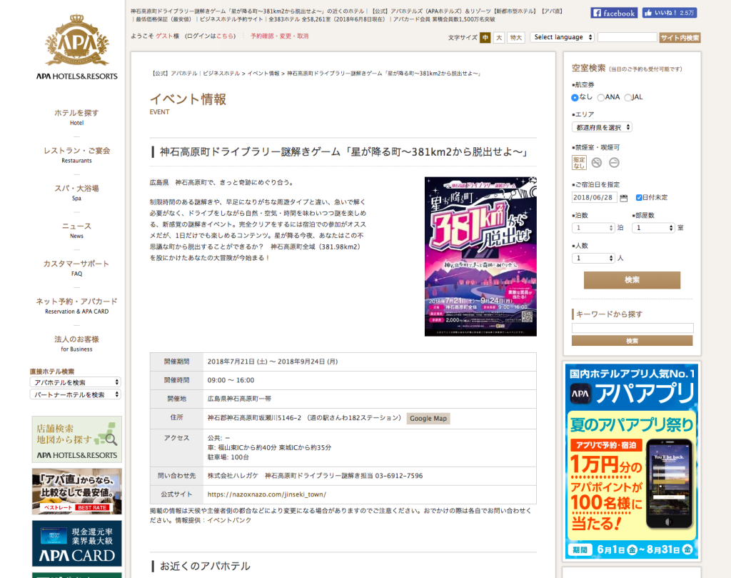 APA HOTEL様に神石高原町ドライブラリー謎解きゲーム「星が降る町~381㎢から脱出せよ~」が掲載されました!