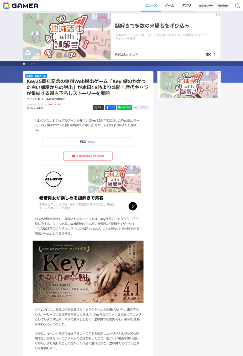 Gamer 様に「Key 鍵のかかった白い部屋からの脱出」が紹介されました。