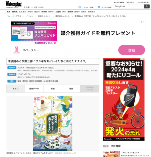 Walkerplus 様 にて、愛知県・清須市で開催中の市制20周年イベント「清須謎めぐり第三弾『フシギなセイレイたちと消えたナナイロ』」が紹介されました。