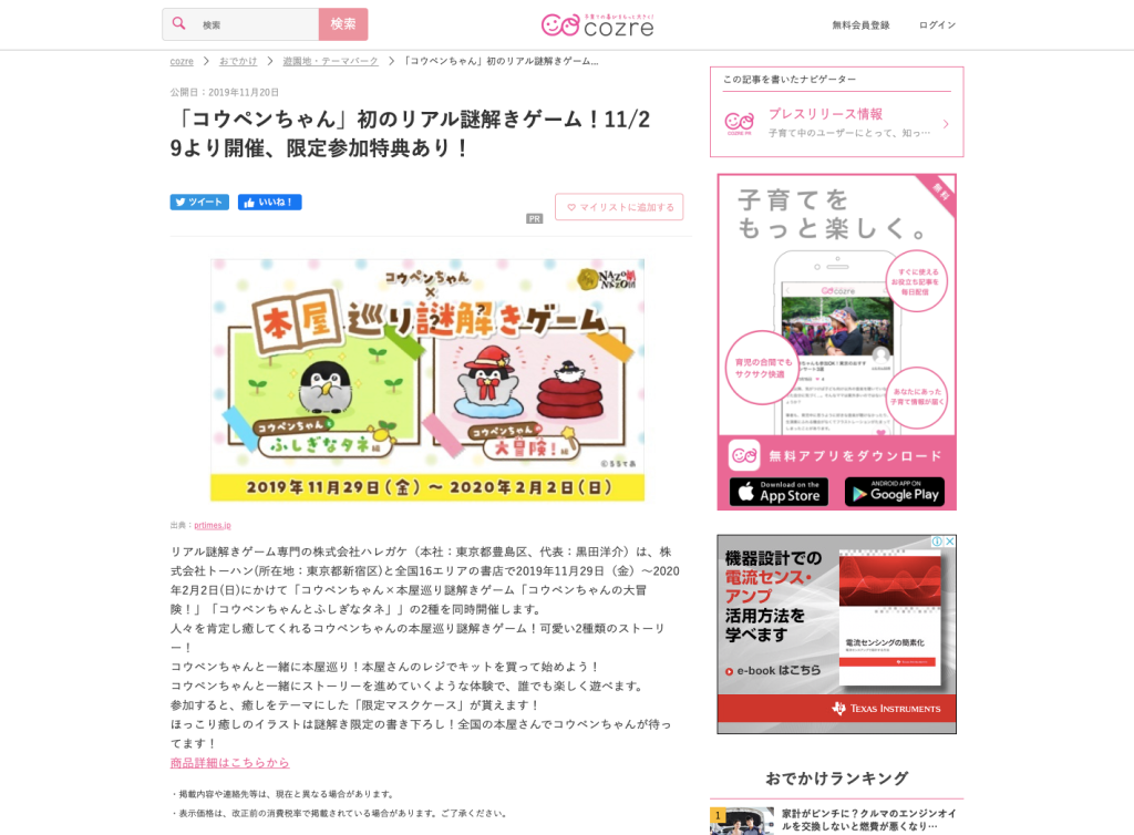 cozre 様に「コウペンちゃん×本屋巡り謎解きゲーム 「コウペンちゃんの大冒険!」、「コウペンちゃんとふしぎなタネ」」が紹介されました。