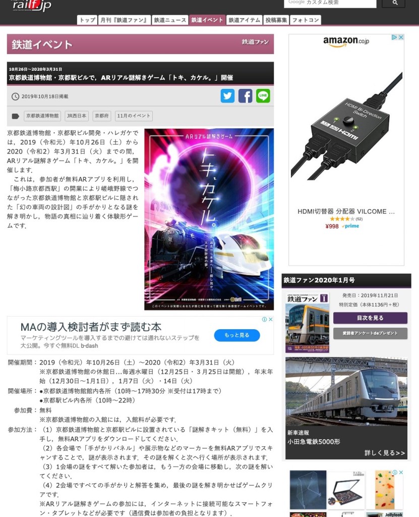 鉄道ファンrailf.jp 様に「ARリアル謎解きゲーム「トキ、カケル。」」が紹介されました。