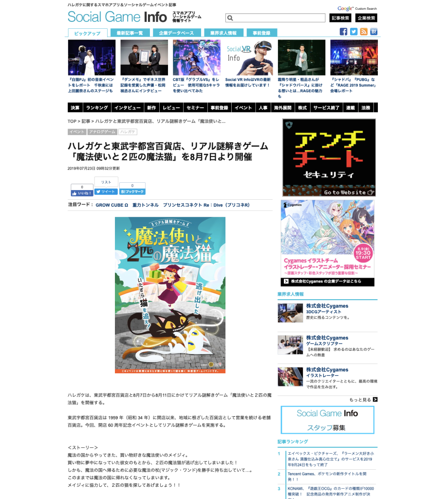 Social Game Info 様に「魔法使いと2匹の魔法猫」が紹介されました。