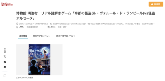 Let’s ENJOY TOKYO 様 にて、愛知県・博物館 明治村で開催中のイベント「博物館 明治村 リアル謎解きゲーム『帝都の怪盗vs怪盗アルセーヌ』」が紹介されました。