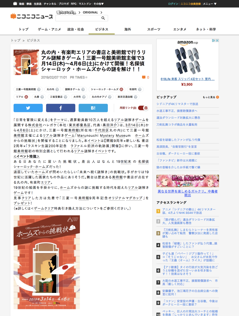 ニコニコニュース様に「Marunouchi Mystery Museum ホームズからの挑戦状」が紹介されました。