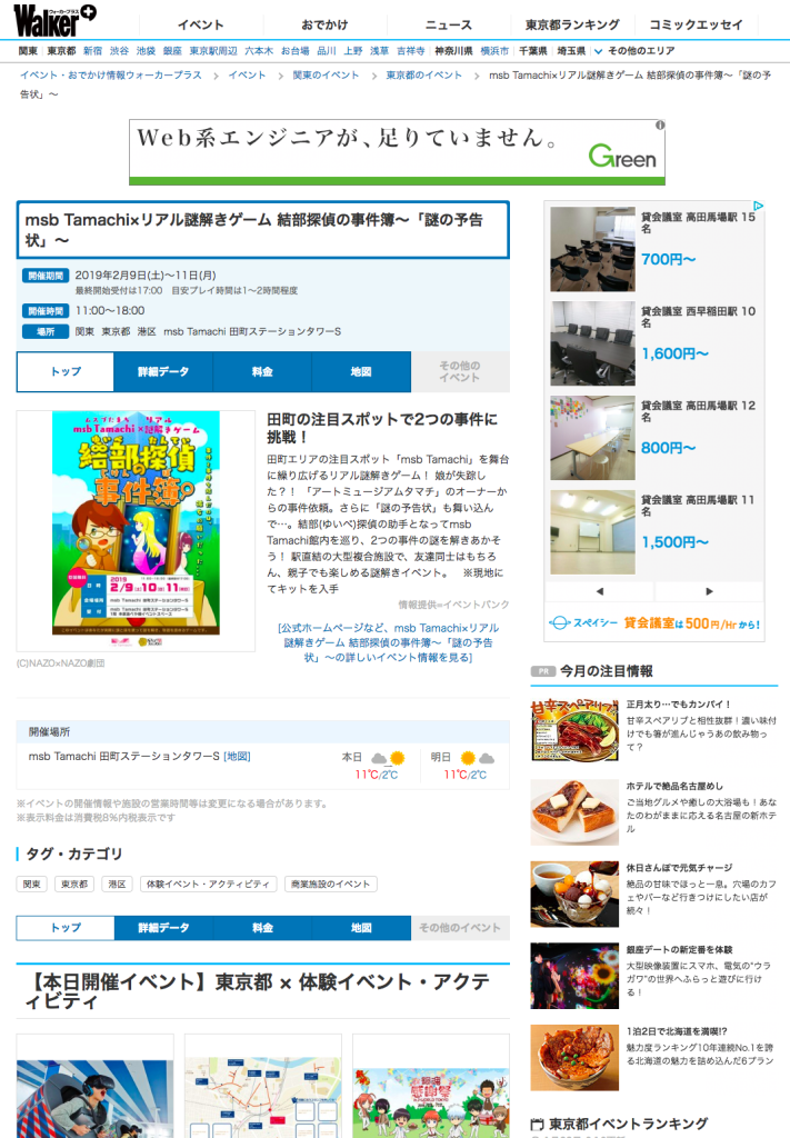 Walkerplus様に「msb Tamachi×リアル謎解きゲーム 結部探偵の事件簿(ゆいべたんていのじけんぼ) ~「謎の予告状」~」が紹介されました!