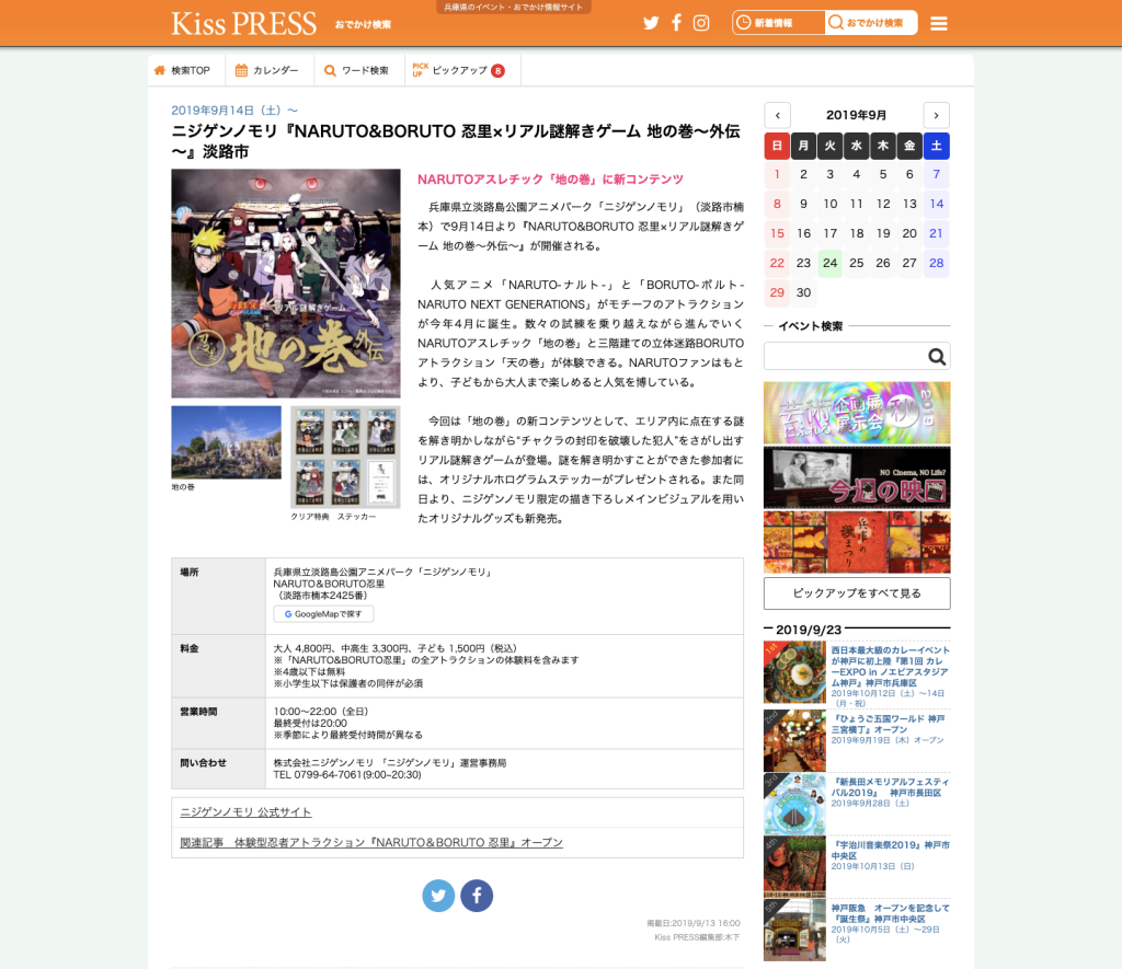 Kiss PRESS 様に「NARUTO&BORUTO 忍里×リアル謎解きゲーム 地の巻〜外伝〜」が紹介されました。