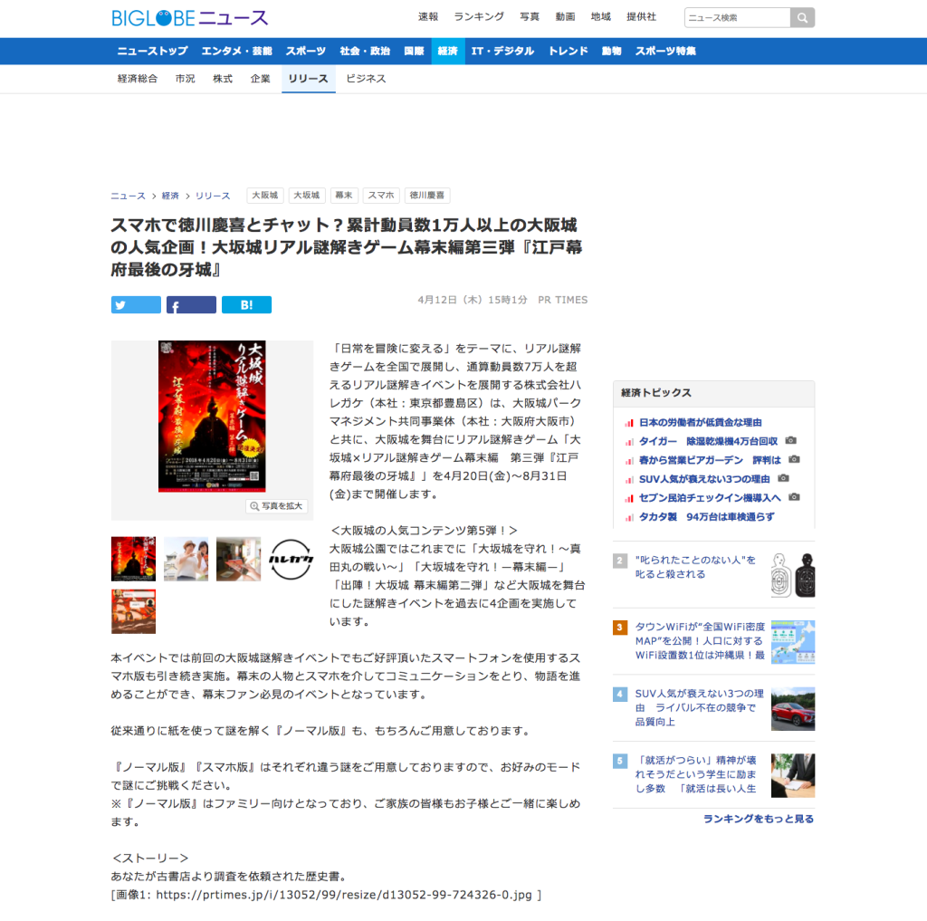 BIGLOBEニュース様に大坂城×リアル謎解きゲーム『江戸幕府最後の牙城』が掲載されました!