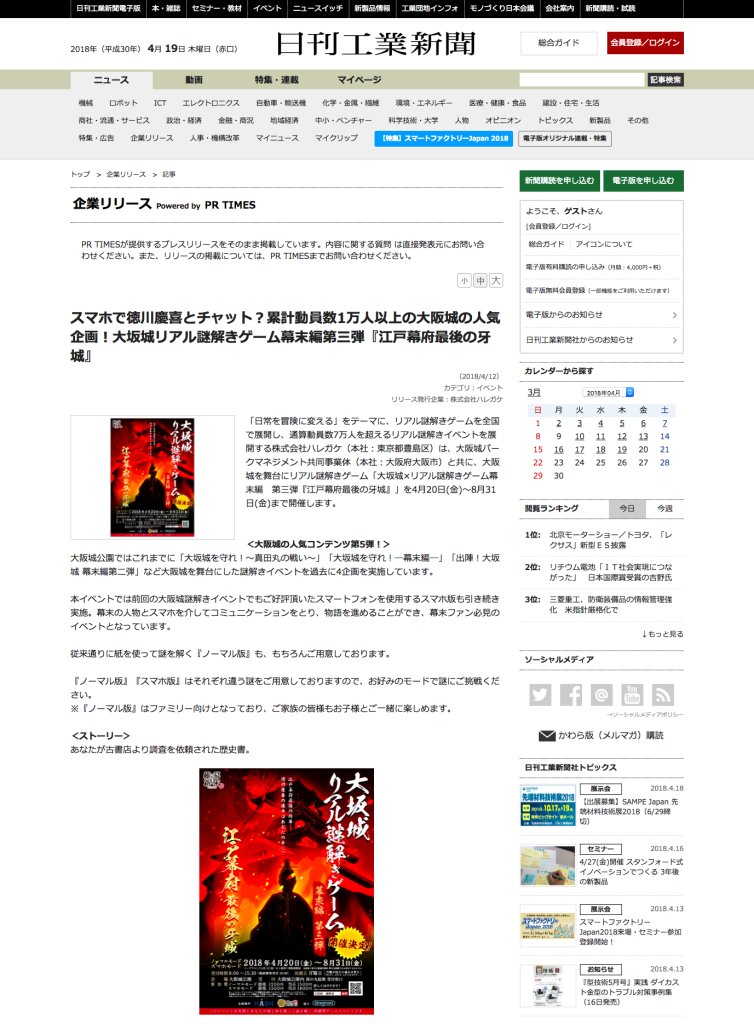 日刊工業新聞様に大坂城×リアル謎解きゲーム『江戸幕府最後の牙城』が掲載されました!