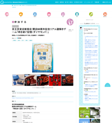 osotoiko 様に「京王百貨店新宿店 開店60周年記念リアル謎解きゲーム「時を紡ぐ記憶(ダイヤモンド)」」が紹介されました。