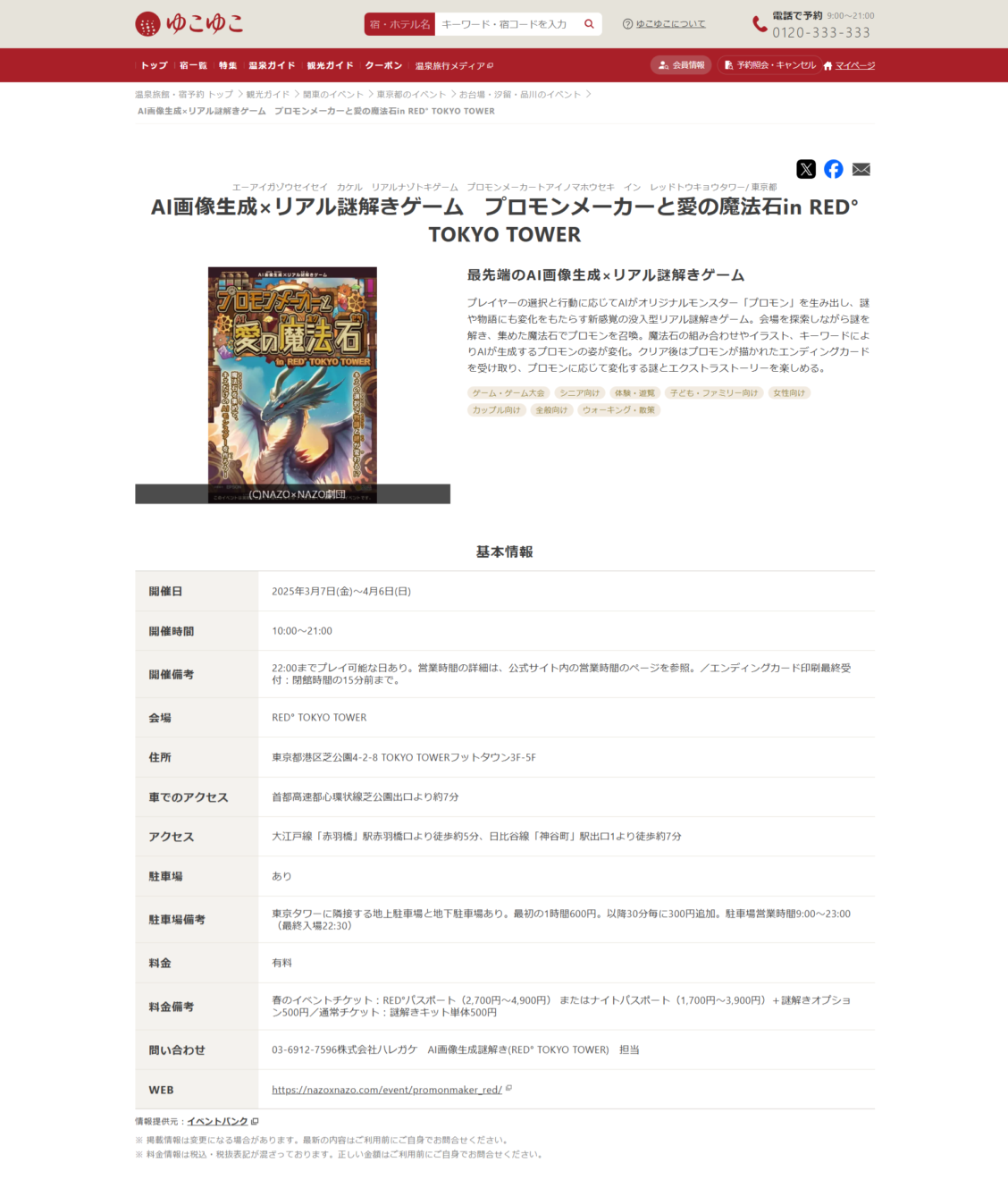 ゆこゆこ 様に「AI画像生成×リアル謎解きゲーム「プロモンメーカーと愛の魔法石」in RED° TOKYO TOWER」が紹介されました。