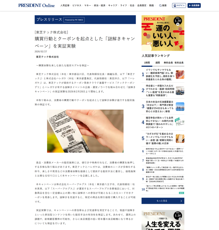 PRESIDENT Online 様に「東芝テック株式会社との「謎解きキャンペーン」実証実験」が紹介されました。