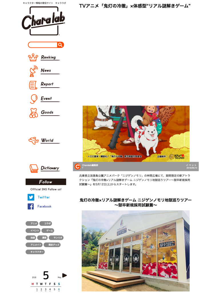 Chara lab様に鬼灯の冷徹×リアル謎解きゲーム ニジゲンノモリ地獄巡りツアー 獄卒新規採用試験篇が掲載されました!