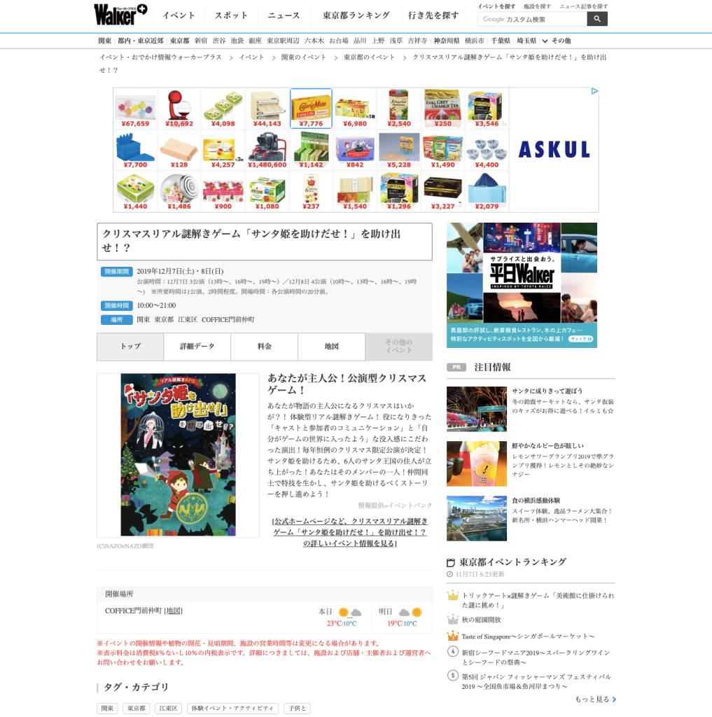 Walkerplus 様に「「サンタ姫を助けだせ!」を助け出せ!?」が紹介されました。