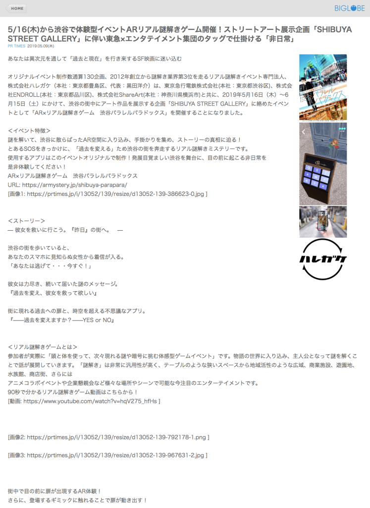 BIGLOBE 様に「AR×リアル謎解きゲーム 渋谷パラレルパラドックス」が紹介されました。