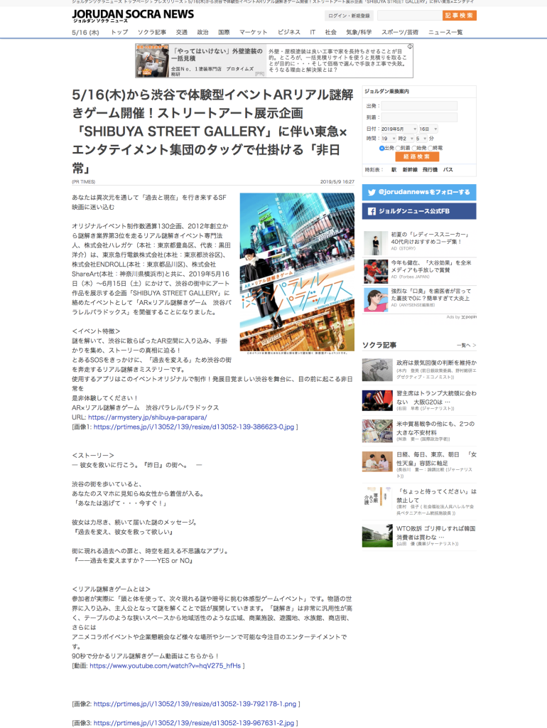 ジョルダンソクラニュース 様に「AR×リアル謎解きゲーム 渋谷パラレルパラドックス」が紹介されました。
