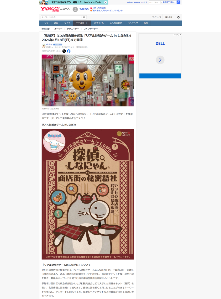 Yahoo!ニュース 様に「リアル謎解きゲームinしながわ「探偵しなにゃん vs 商店街の秘密結社」」が紹介されました。