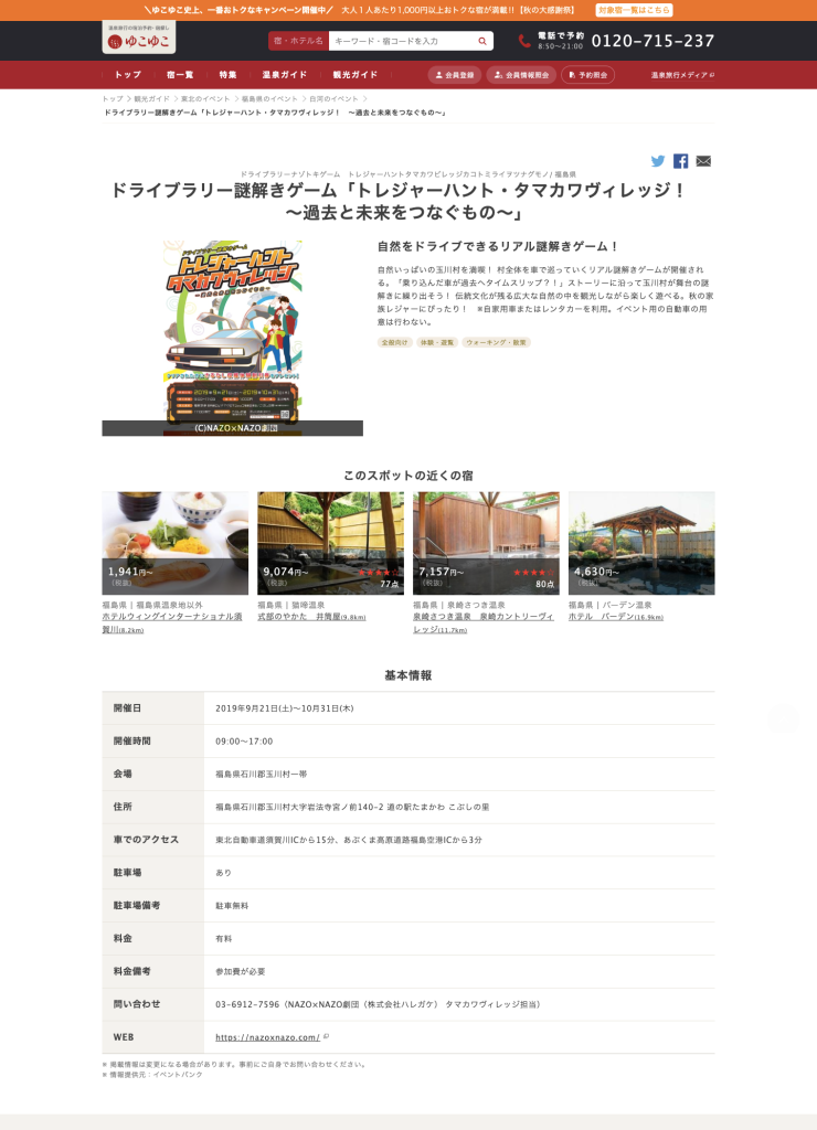 ゆこゆこ 様に「ドライブラリー謎解きゲーム「トレジャーハント・タマカワヴィレッジ! ~過去と未来をつなぐもの~」」が紹介されました。