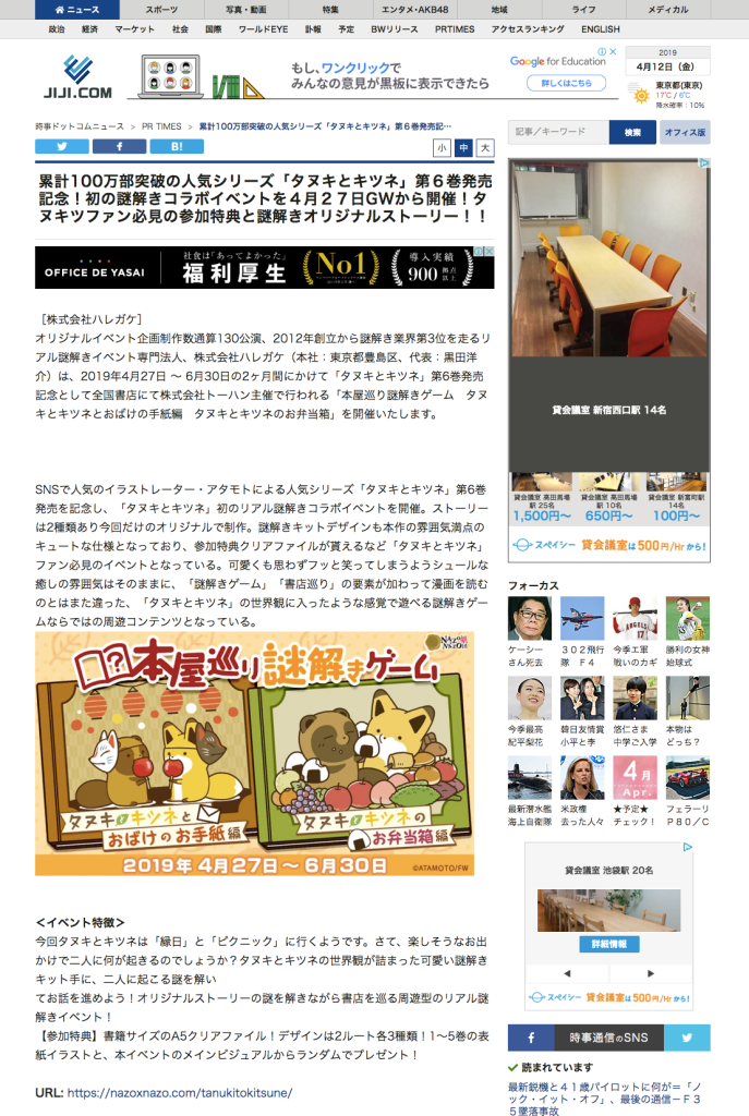 JIJI.com 様に「本屋巡り謎解きゲーム タヌキとキツネとおばけの手紙編 タヌキとキツネのお弁当箱編」が紹介されました。