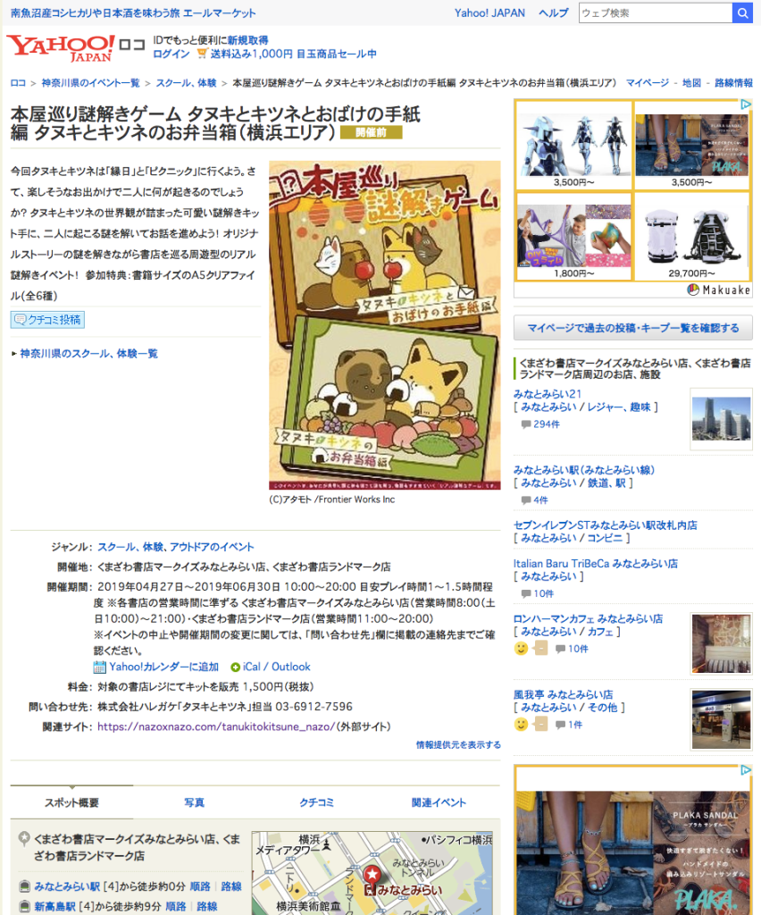 yahooロコ 様に「本屋巡り謎解きゲーム タヌキとキツネとおばけの手紙編 タヌキとキツネのお弁当箱編」が紹介されました。