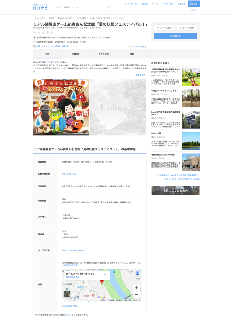 ロコナビ 様に「リアル謎解きゲームin寅さん記念館「夏の妖怪フェスティバル!」」が紹介されました。