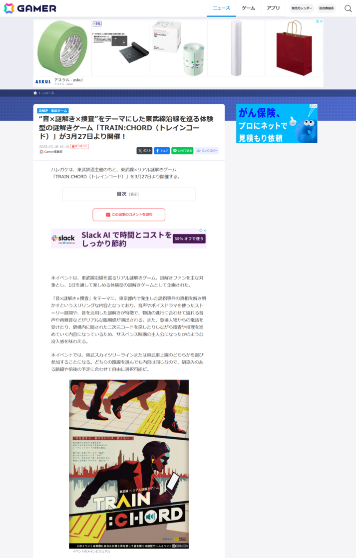 Gamer 様に「東武線×リアル謎解きゲーム「TRAIN:CHORD(トレインコード)」」が紹介されました。