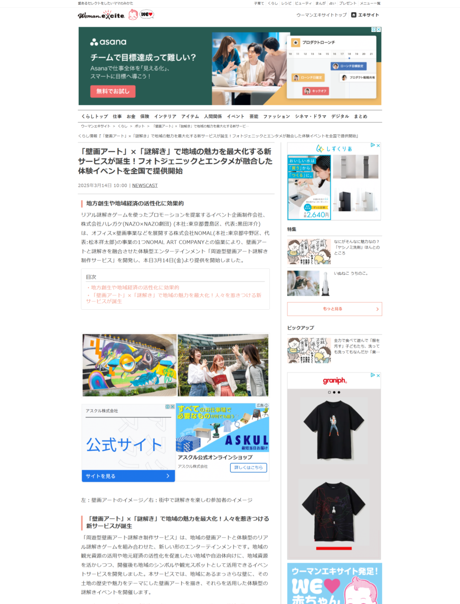 Woman excite 様に 新サービス「周遊型壁画アート謎解き制作サービス」が紹介されました。