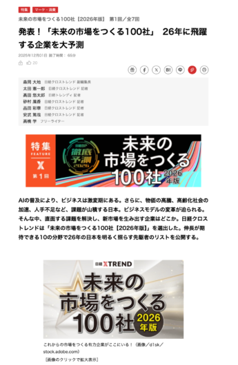 日経クロストレンド様 が企画する「未来の市場をつくる100社【2026年版】」にて、ハレガケを選出していただきました。