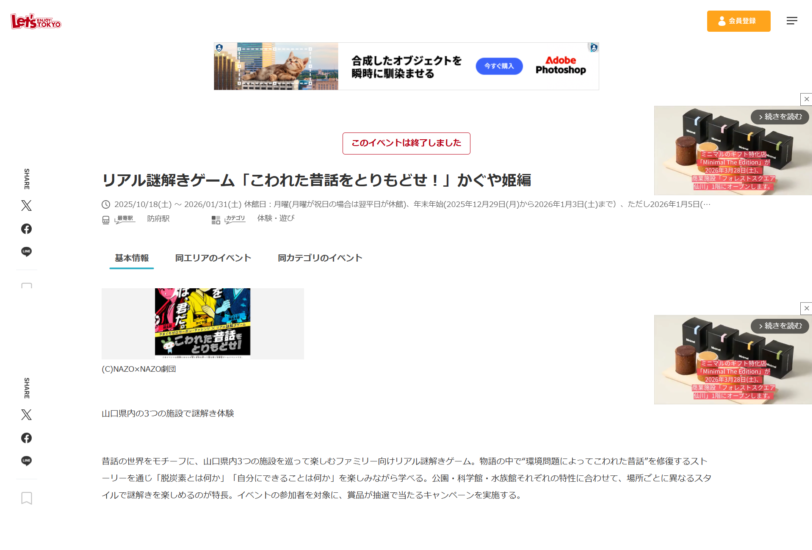 Let’s ENJOY TOKYO 様に「リアル謎解きゲーム「こわれた昔話をとりもどせ!」」が紹介されました。