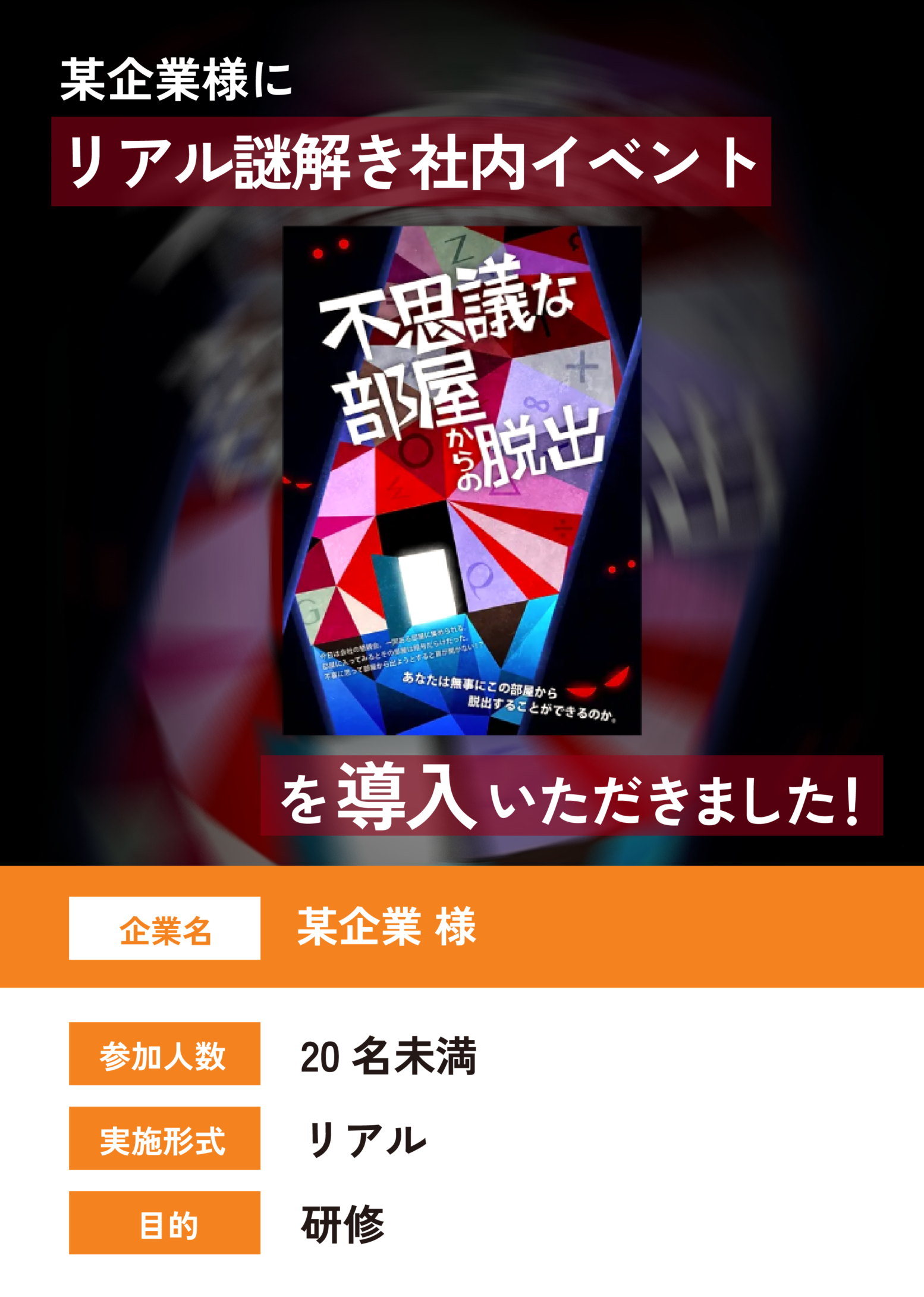 謎解きゲームを使った企業様の懇親会や社員旅行など100社以上で実施し、新社会人から中高年の役員まで高い満足度を得ています。